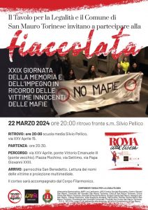 Si comunica che in data venerdì 22 marzo alle ore 20.00, all’interno della fiaccolata di Libera per le vittime di Mafia, ci sarà un’azione di pace preventiva sul ponte vecchio di San Mauro, promossa dall’artista Michelangelo Pistoletto, in cui sono coinvolte tutte le scuole del territorio. Il ritrovo è alle ore 20,00 presso la scuola media Silvio Pellico in via XXV Aprile 15. Il percorso inizia da via xxv Aprile e proseguirà per ponte Vittorio Emanuele III (ponte vecchio), piazza Mochino, via Settimo, via Papa Giovanni XXIII, fino ad arrivare alla parrocchia San Benedetto, dove ci sarà la lettura dei nomi delle vittime di Mafia ed una proiezione multimediale.