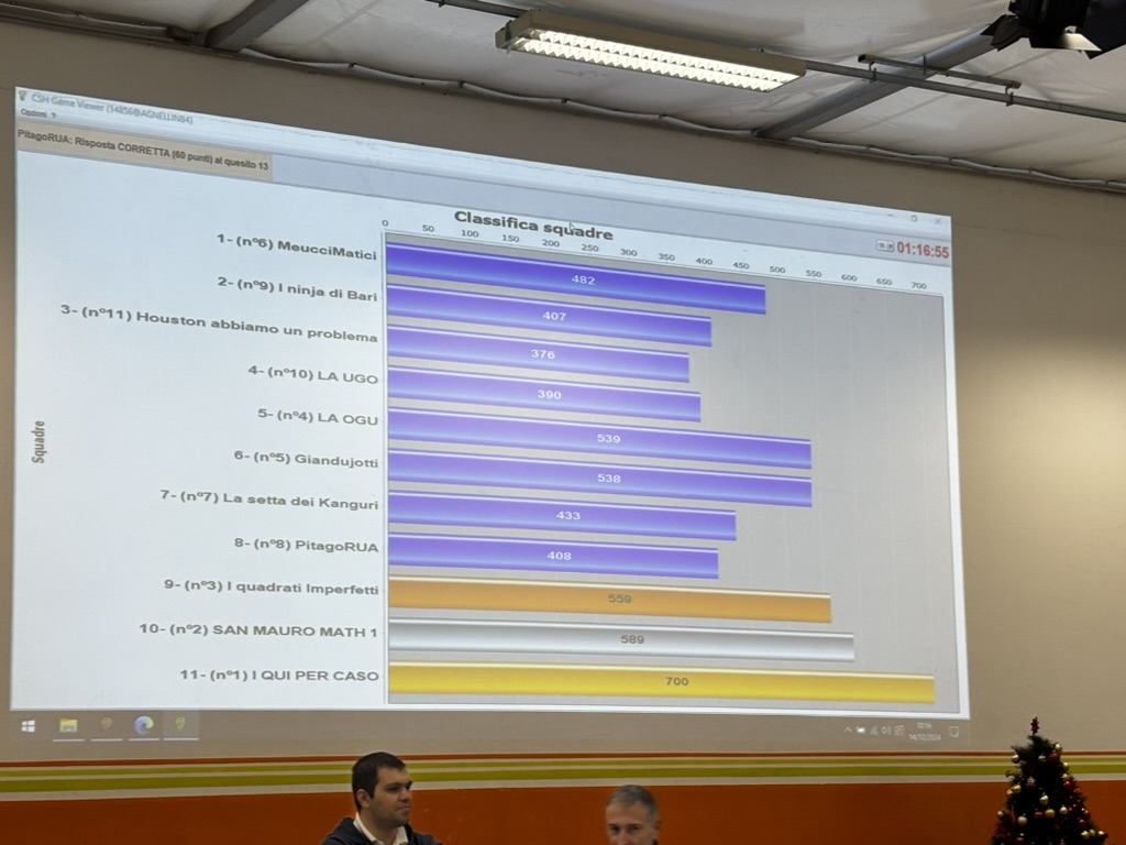 Oltre alla competizione individuale, c’è anche la possibilità di partecipare alla gara a squadre. Le squadre più forti saranno selezionate in base ai risultati ottenuti in diverse fasi preliminari. La selezione avverrà attraverso le gare svolte a livello locale, che si terranno il 14 dicembre 2024, tra cui una delle sedi sarà l’Istituto Agnelli di Torino. Un’altra opportunità di selezione verrà offerta dalle gare a squadre online, in programma il 25 marzo 2025. L’ultima possibilità di qualificazione per la competizione a squadre sarà rappresentata dai risultati ottenuti nelle gare individuali del 20 marzo 2025, le scuole che avranno ottenuto i risultati migliori a livello individuale potranno partecipare anche alla finalissima delle gare a squadre che si terrà a Cervia nel mese di maggio 2025.